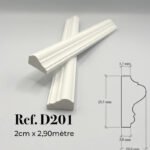 Moulures décoratives en HDPS conçues pour une finition intérieure élégante. Leur surface lisse permet une application rapide de la peinture, au pinceau ou au pistolet. Léger mais résistant, ce matériau facilite la pose en plafond ou mur.